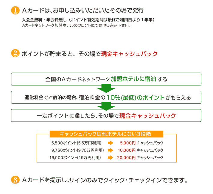 Aカードは、全国の各ホテルが発行しているポイントカードシステムの中で、キャッシュバック率No,1のカードです。